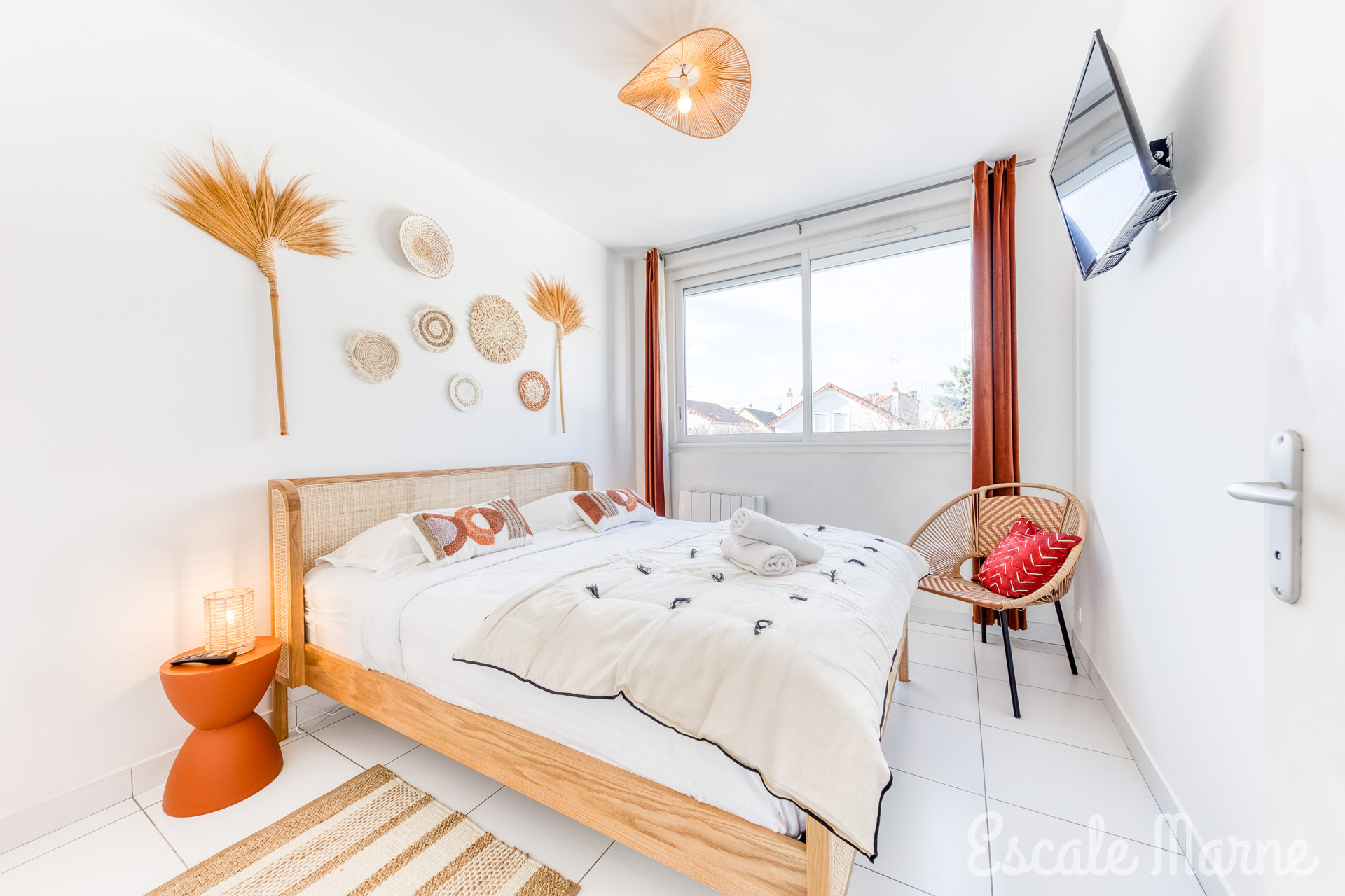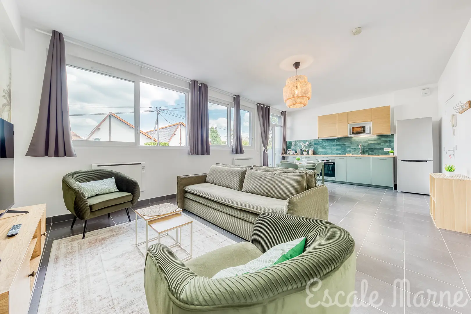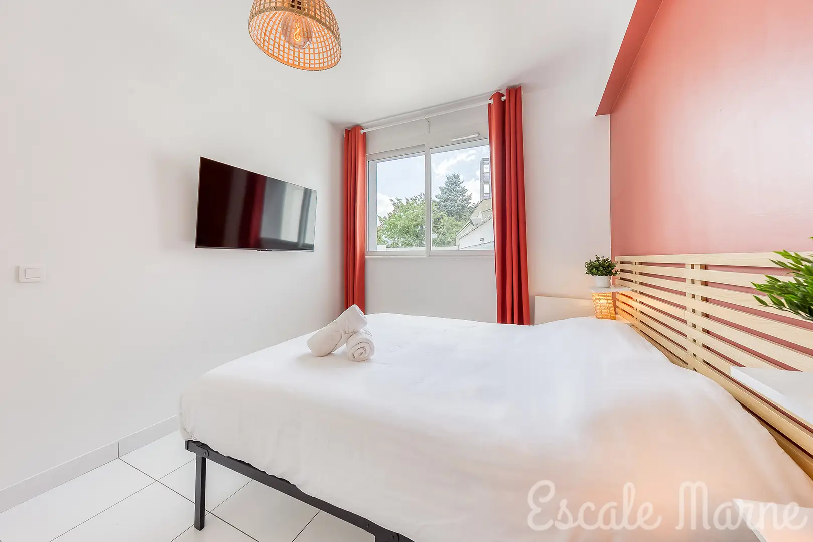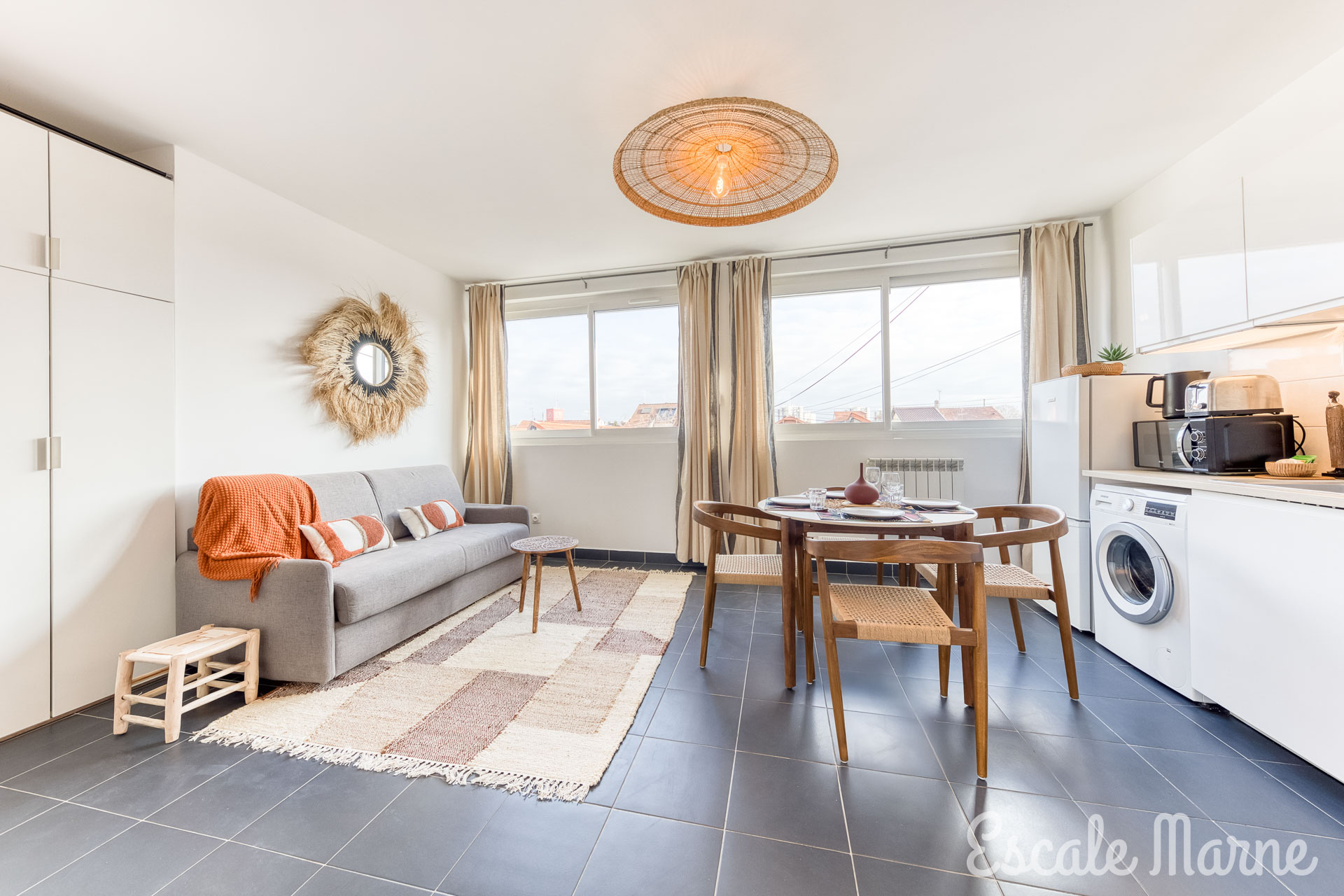 Appartement entier, 4 personnes, à 10mn du métro 8, RER A, Parking rue Gratuit, Cuisine Équipée, Grand lit haut de gamme, Matelas Eve Sleep, Rez-de-chaussée.